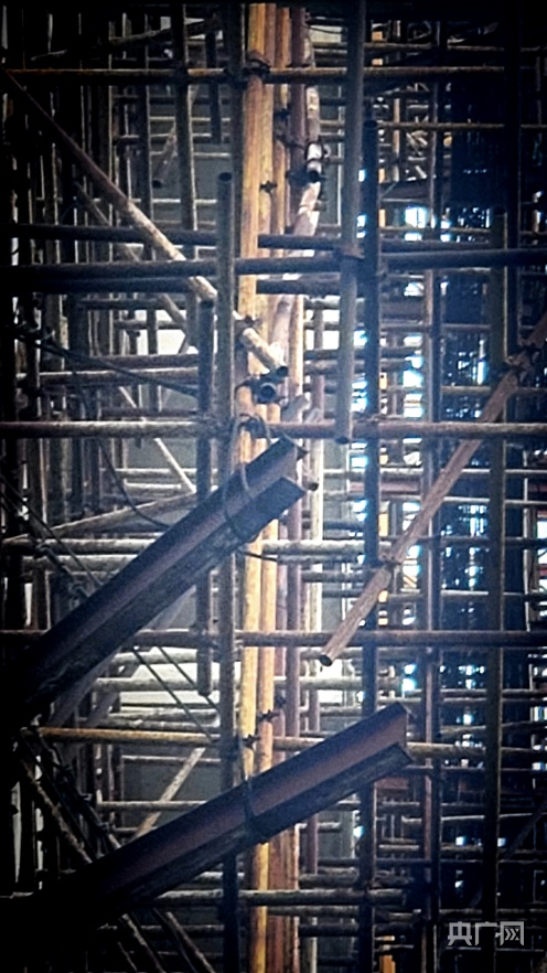 记者通过长焦镜头观察,明显可见脚手架上钢构件锈蚀非常严重。有几根粗大槽钢,仅用一根皮线、铁丝或钢索缠绕了几圈。可以想象,它们在大风中一定会不断与相邻钢构件碰撞,猛烈碰撞,发出惊心破胆的声音,加剧了附近部分居民心理负担。