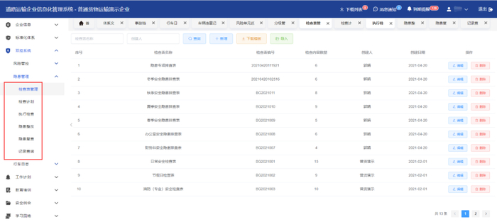 依据交通运输企业特性,智能输出全套可参考的体系文件范本,内容涵盖目标与考核、安全责任体系、安全投入、教育培训、危险辨识与风险管控、隐患排查和治理等16个模块;体系资料匹配动态更新规则,协同工作提醒功能,实时引导企业安全管理人员自主管理;支持分模块一键导出,生成成套的体系文件,方便线下存档。
