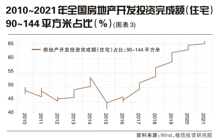 造成房价上涨预期刚性的首要原因是供需错配。在中国传统思想和文化中,房子是安居乐业的基础。这种观念一定程度上决定了国人拥有房产的意愿较为强烈。经过近四十年的经济高速增长,我国城镇居民家庭收入和财富出现了大幅增长。收入和财富的显著增长为住房需求上升提供了坚实的基础。调查数据显示,2019年城镇居民家庭拥有一套住房的家庭占比为58.4%,有两套住房的占比为31.0%,有三套及以上住房的占比为10.5%,户均拥有住房1.5套。1999~2019年,全国城镇居民人均住宅面积从22平方米增加至39.8平方米。而2010年至今,全国房地产开发投资完成额(住宅)中,90~144平方米的占比保持稳步上升,今年以来已经超过65%,较2010年上升近20个百分点(图表3)。供需两端的数据皆表明,城镇居民对住房的新增需求和改善需求持续增加,而房价上涨带来的财富效应则反过来刺激了投资和投机需求增长。