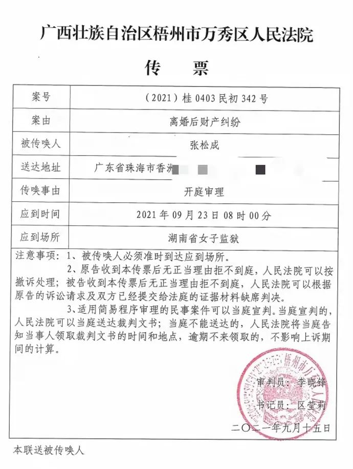 广西梧州万秀法院传票 来源:受访者供图三名落马法官的刑事判决书显示,2011年七八月份和2012年上半年,万秀法院副院长金明收受了许淑清儿子、中恒集团副总裁赵学伟的好处费12万元。