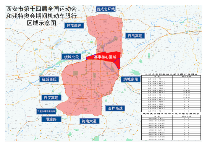 (一)普通限行区域:在西安市现行工作日尾号限行区域【以西安市绕城高速以内区域为中心,向南扩展至终南大道、堰渡路、三星快速干道(不含路)连线以北,西汉高速以东,西柞高速以西围合区域;向北扩展至西咸北环线(不含路)以南、包茂高速以东、西禹高速以西围合区域】的基础上,增加西安市绕城高速公路全段(含路)。