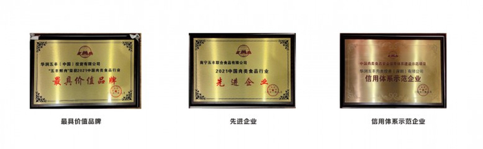 在今年,华润五丰荣获 2021中国肉类食品行业“最具价值品牌”、2021中国肉类食品行业先进企业、2021中国肉类食品安全信用体系建设示范项目“信用体系示范企业”。