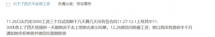 双方在口头约定了工资,以及三个月试用期,干几天算几天,没有签合同。我上了四天班,其中休息了一天休息,且提前一天跟她讲不去上班,她也表示同意。我微信找她要工资,她以我没有提前半个月通知她为由,拒绝给我发工资,并微信拉黑删除我。我该怎么办?