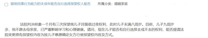 孩子目前九周岁多,已有一定的自主意识和认知能力,探望权的行使应尊重孩子的真实意愿。在具体解决该问题时,建议从孩子的利益出发,先就此与前妻进行协商,你作为直接抚养孩子的一方也应及时对孩子进行疏导、教育;双方无法达成一致的,可以向法院起诉要求变更探望的方式和时间。