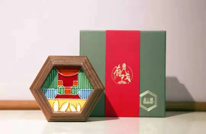 今年“日晖有戏”特别推出了一系列新品,比如一款海上香砖,六边形的画面以江水为舞台,象征着戏曲文化在徐汇的源远流长、生生不息,舞台上“一桌二椅”和上方升起的一轮旭日,则呈现“日晖”的含义。