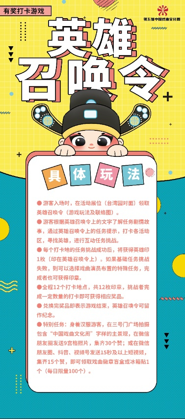 “英雄召唤令”以戏曲为主题,是开放式户外互动挑战、任务打卡活动,所有进园博园参观的游客均有机会参与。游客在入园时,接到活动谜题和打卡任务,根据线索前往各个任务地点,与真人戏曲演员进行互动挑战并打卡。完成一定数量打卡任务的游客,可获得相应活动的奖品。