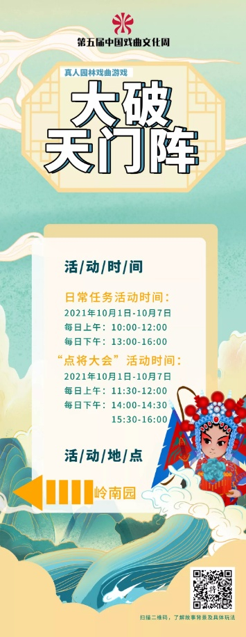 “大破天门阵”是结合了戏曲元素的开放式户外沉浸演绎游戏,所有进入岭南园参观的游客均可参与。游客在入园前,参与解谜小游戏,即可获得“大破天门阵”游戏的手环,根据工作人员的指引,前往园区内寻找戏曲演员,与真人戏曲演员进行互动演绎、益智解谜等挑战。