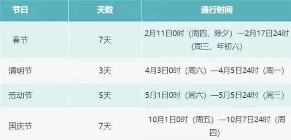 ■ 根据《重大节假日免收小型客车通行费实施方案》,收费公路免费通行时间为——春节、清明节、劳动节、国庆节共4个国家法定节假日,以及当年国务院办公厅文件确定的上述法定节假日连休日。