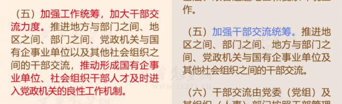 相比于旧版,新版条例在党政领导干部交流制度方面有了一些变化,原来的 “ 加强干部统筹 ” 改为 “ 加强工作统筹,加大干部交流力度 “。
