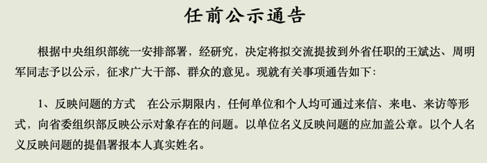 浙江的公示通告中,第一句是这么写的,“根据中央组织部统一安排部署,经研究,决定将拟交流提拔到外省任职的王斌达、周明军同志予以公示,征求广大干部、群众的意见”。