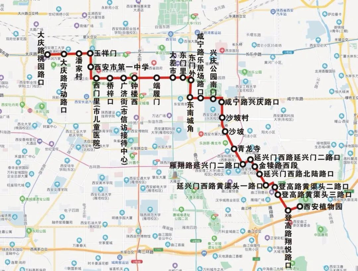 新增站点8个:西安植物园、登高路翔悦路口、登高路黄渠头三路口、登高路黄渠头二路口、延兴门西路黄渠头一路口、延兴门西路北陆路口、延兴门西路延兴门二路口、雁翔路延兴门二路口。