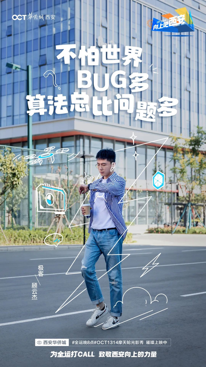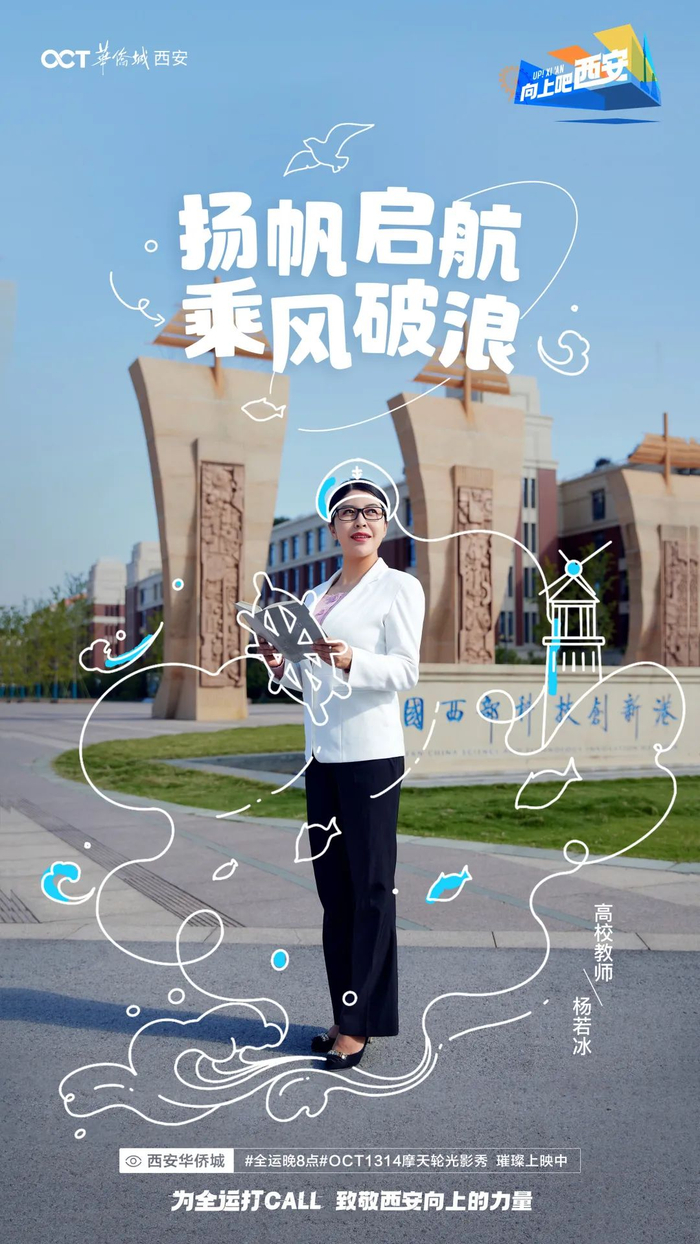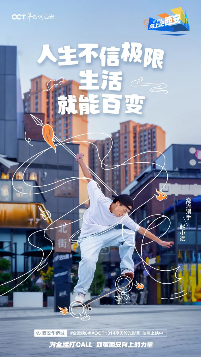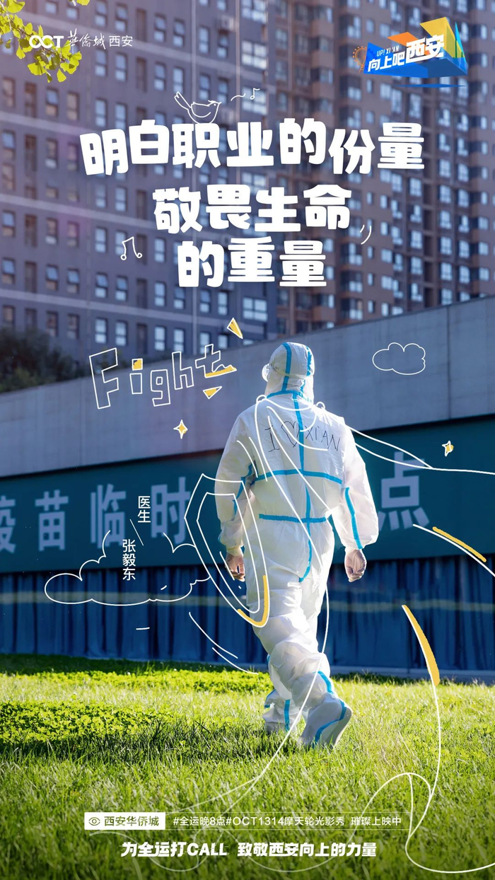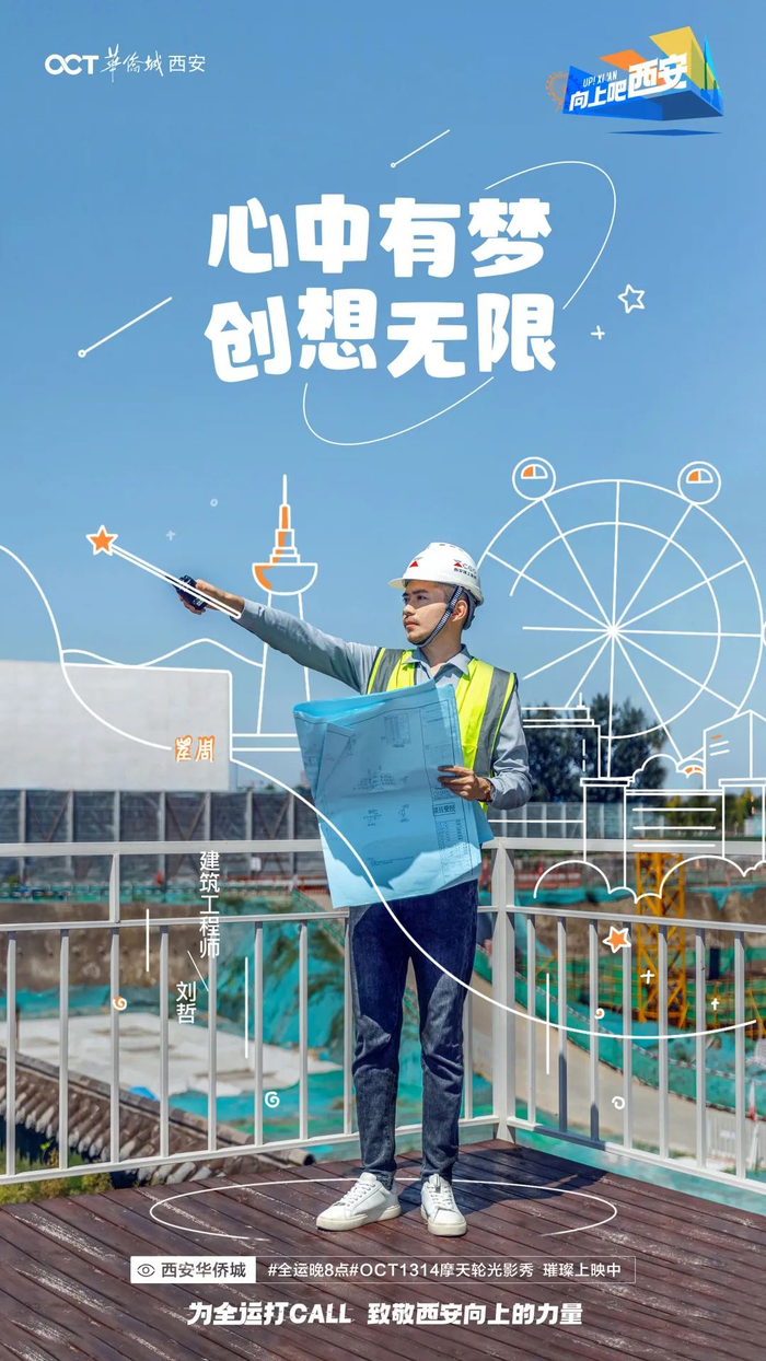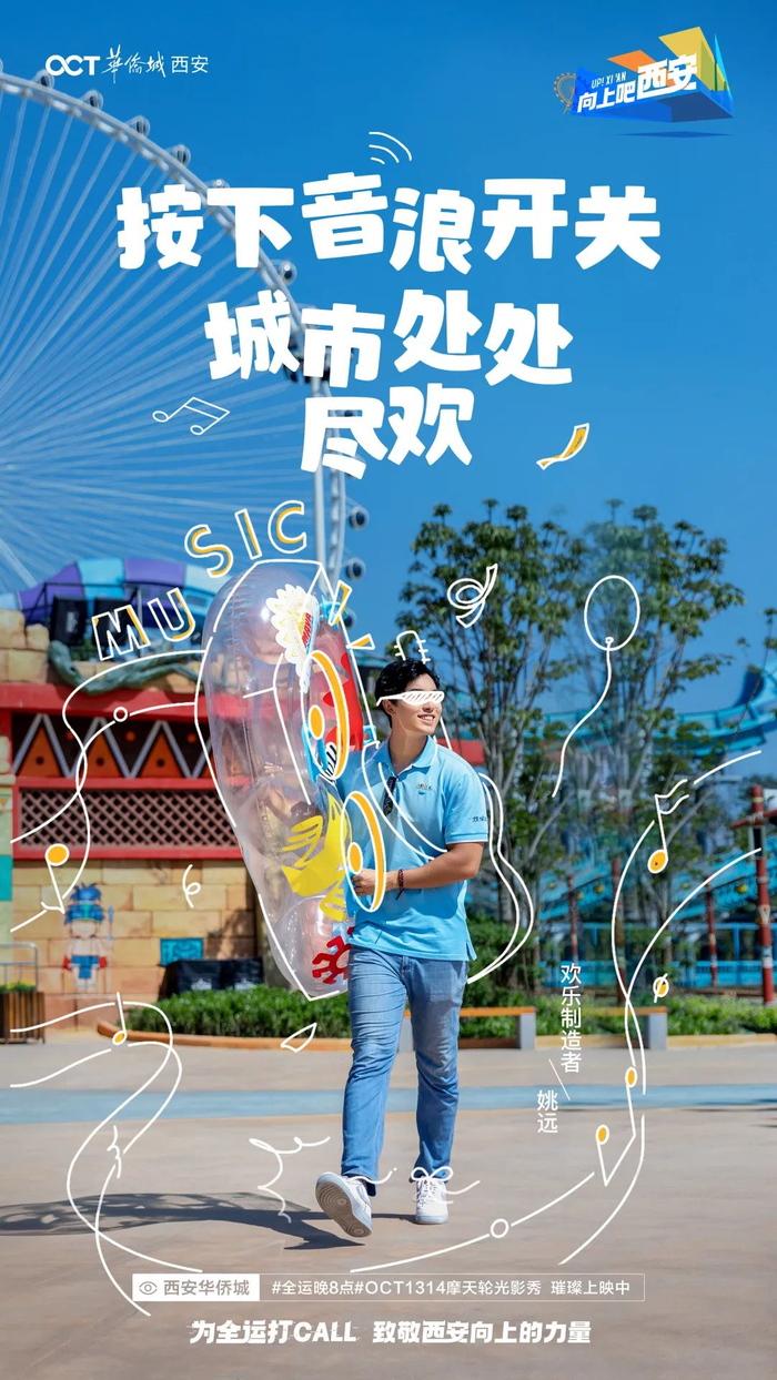 而在整个全运期间,西安华侨城以#向上吧 西安#为口号,呈现了精彩的“全运晚8点”OCT1314摩天轮光影秀、#向上吧 西安#全运创意短片及#城市向上人物#系列大片!