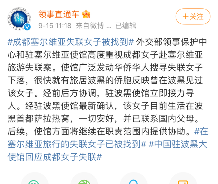 此前外交部领事保护中心官方微博发布消息称女孩已找到