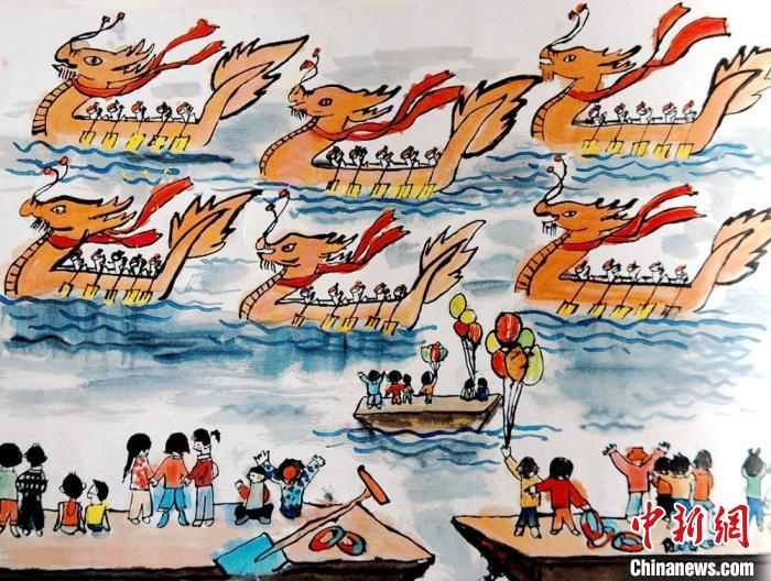 1981年荣获南斯拉夫国际儿童画展金奖作品《赛龙舟》。当年女画童王庆,如今已成长为睢宁文联主席。 王庆供图