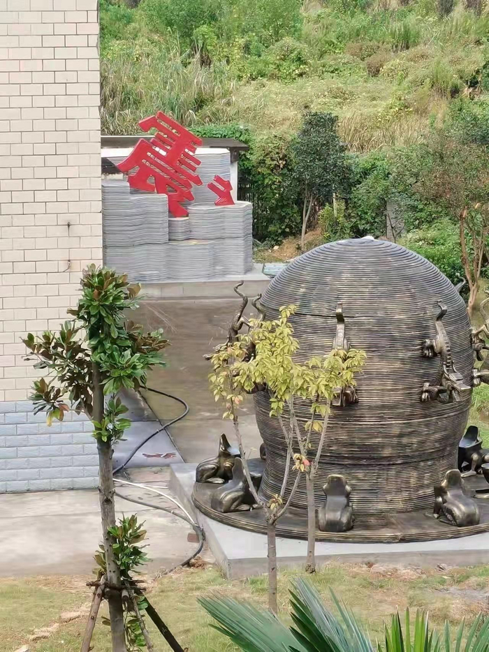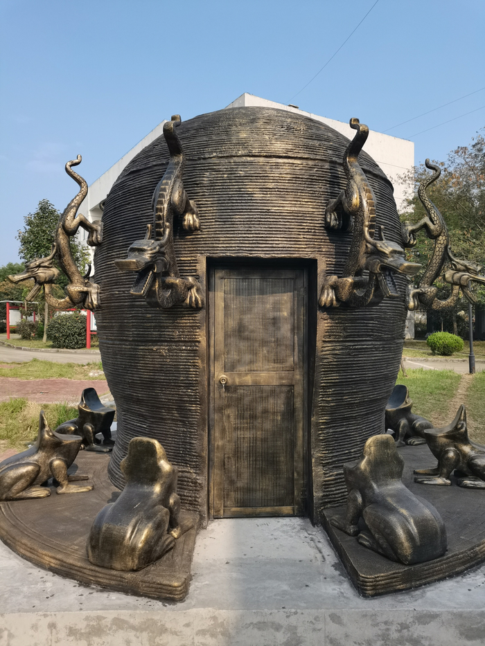 比如说候风地动仪外形的地震观测井房,整体呈古铜色,形似“炼丹炉”。墙上嵌着的8条龙头和8只蟾蜍雕塑,上下呼应,栩栩如生,井房外墙的条纹纹路还有着3D打印技术逐层打印的痕迹。