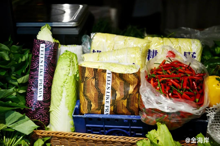 不仅建筑外墙裹上了几何图案印花,蔬菜水果们也“穿上”了FEELS LIKE PRADA的新装,躺在摊位上,等待摆拍和认购。