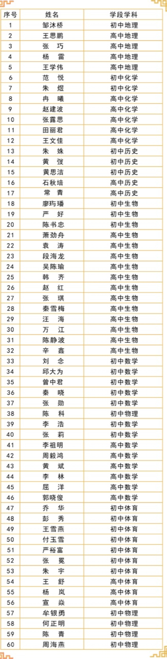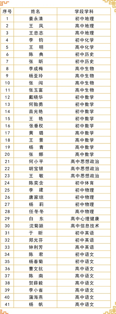 据悉,育才中学184名教师经过个人申报、学校初审、九龙坡区教委复审以及专家、教师代表、家长代表评审等多轮评审,并经全区公示后成功获评。其中,5名教师获评“九龙名师”,12名教师获评“九龙坡区学科带头人”,41名教师获评“九龙坡区学科教学名师”,126名教师获评“九龙坡区中青年骨干教师”。