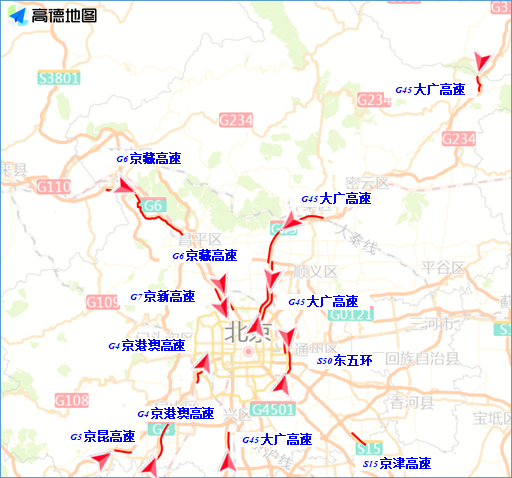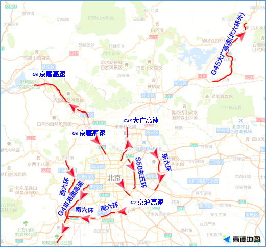 1日、2日上午6时至13时和3日7至12时,京藏、京承、机场、京港澳、京开、京沪、京哈等多条高速公路和部分国道出京方向的交通压力将明显上升,其中京藏高速清河收费站、沙河大桥、昌平西关、居庸关、野生动物园出口,京承高速望和桥、来广营桥,京港澳高速杜家坎、长阳路段,京开高速玉泉营、新发地等路段都是出京易拥堵的点段。