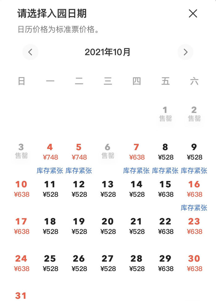 截至9月30日10时,北京环球影城官方小程序显示,10月1日、2日、3日、6日的门票已售罄,假期其他日期门票库存紧张。票价方面,10月4日、5日的成人票价为748元,10月7日的成人票价为638元。