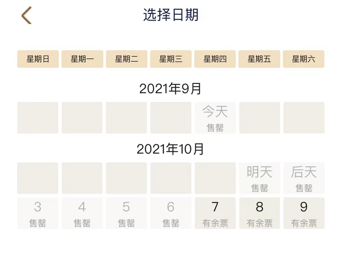 截至9月30日10时,故宫博物院官方购票微信公众号显示,10月1日至10月6日的门票均已售罄,10月7日尚有余票。