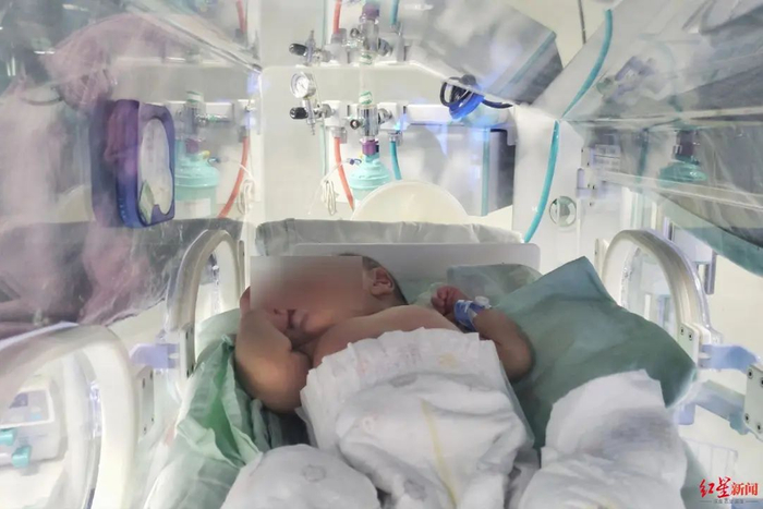 9月29日,是贝贝住院的第三天。下午,红星新闻记者在新生儿科见到了躺在婴儿保温箱里贝贝,正在熟睡,肤色已经十分红润。婴儿保温箱上方的仪器显示,贝贝的血氧饱和度在90多。