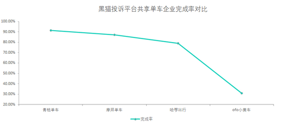 黑猫投诉共享单车企业投诉数据对比:ofo小黄车完成率较低