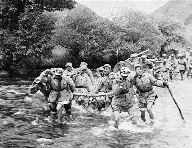 1950年,筑路大军挺进西藏途中,官兵们在冰冷刺骨的河水中抬运石料 (资料照片)。新华社发