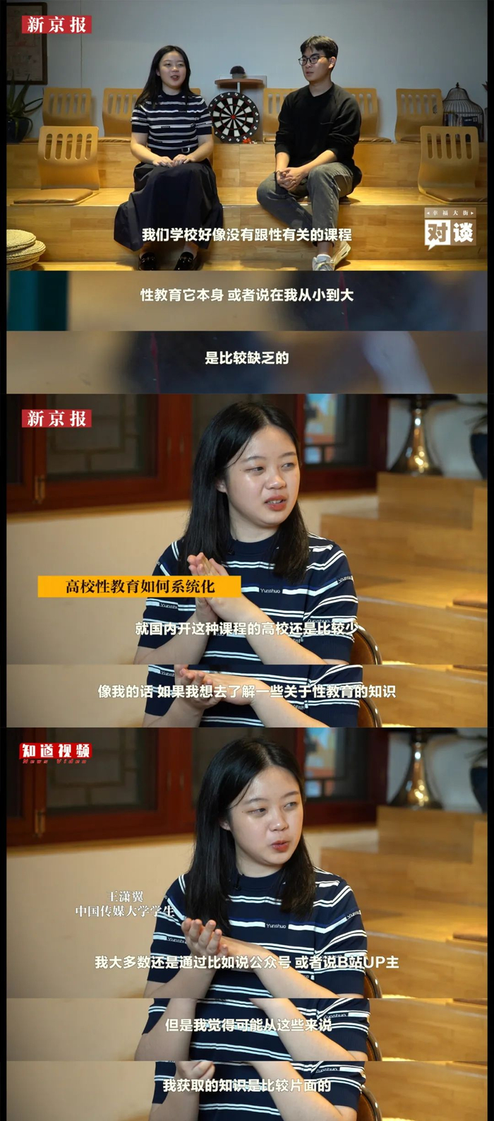 中国传媒大学学生王潇翼自述,在成长过程中接受过的性教育寥寥,在她看来,很多大学生的性知识都来源于公众号和B站。
