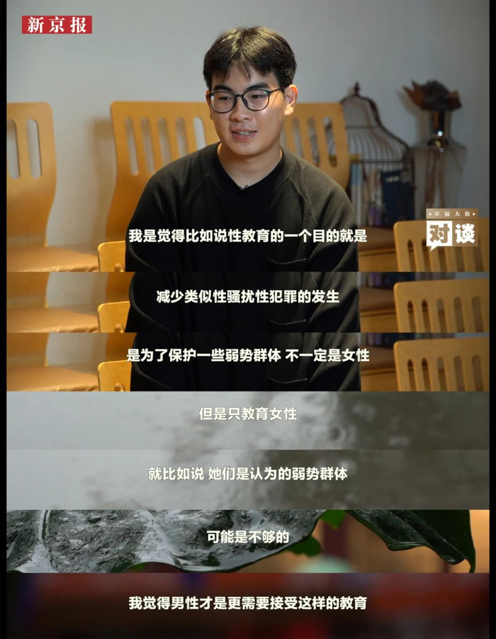 在被问到性教育涉及哪些内容时,冯勖卿认为,“广义上跟性有关的,包括两性关系、性少数群体、恋爱等话题,可能都属于性教育。”