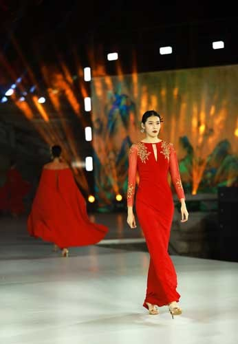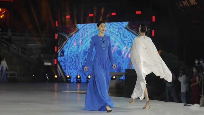 传统文化剧目表演之外,身穿EVE CINA高级定制礼服的时尚模特们依次登场,以黄鹤楼轩廊、亭阁为走秀舞台,在荆楚之地上演绎了一场国潮大秀。他们将布依族、苗族、蒙古族、白族、哈尼族、黎族等30多个民族美学文化集中呈现。