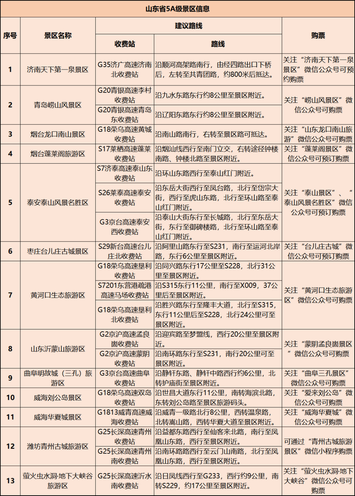 山东省5A级景区信息