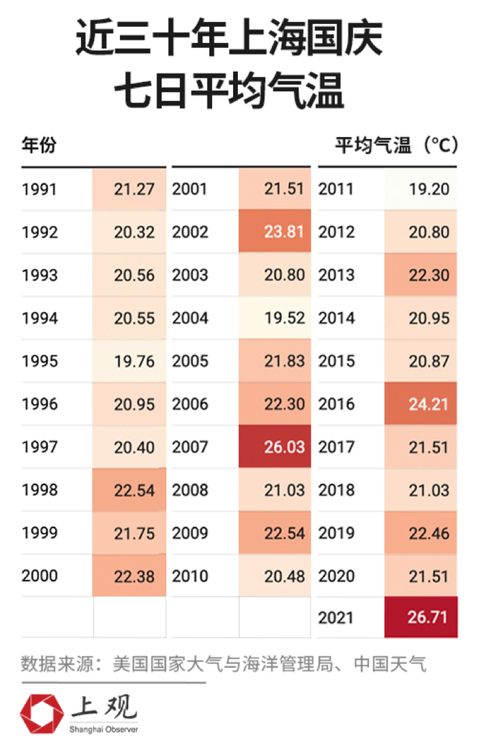 也就是说,未来七天的平均气温将在26℃至27℃度左右,过去三十年,上海国庆假期的平均气温一般就在21℃至22℃左右,今年真的创了近三十年来的最高水平。