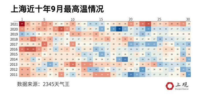 按照往年的记录,南方9月即使有高温,也都集中在月初,但今年持续时间特别长。以上海为例,往年9月上海的高温天气集中在9月1日到10日,过了9月15日后,气温一般便在25℃左右,很少再超过30℃。而今年9月15日过后,气温反而逐渐升高,几乎每天都在30℃以上。