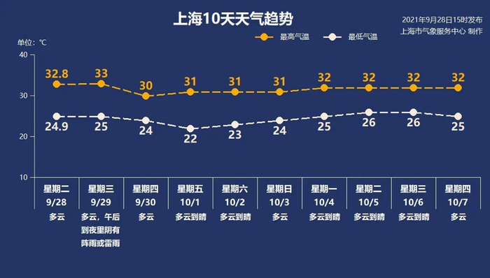 根据预测,上海国庆假期的七个休息日最高温度或都将超过30℃。