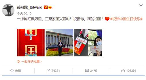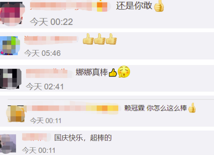 对于欧阳娜娜等人今日发文祝福祖国繁荣昌盛、祝新中国生日快乐,不少大陆网友为他们点赞:真棒!↓