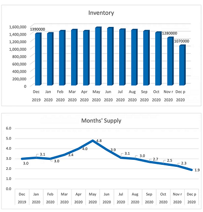 美国房产经纪人协会的数据显示,2020年美国的销售量约600万套,但2020年12月,其库存只有107万套,仅为1.9个月的供给量,创历史最低记录。