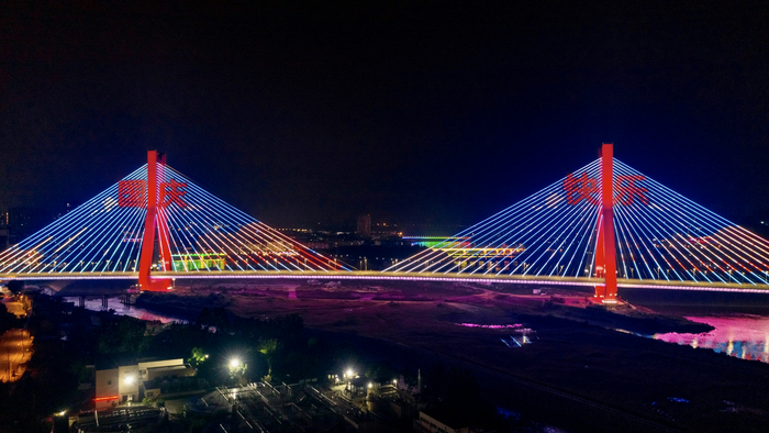 此外,金堂大桥两个主塔以中国红为主色调,桥塔如同两个身披彩衣的红色钢铁巨人,屹立在沱江上,守护公园水城金堂人民的幸福和安康。大桥的68对斜拉索安装有LED灯饰,夜幕降临时,金堂大桥上演璀璨灯光秀,让水城夜色更加熠熠生辉。据悉,9月30日,金堂大桥还上演了烟花秀,绚丽的烟花加上炫酷的灯光秀,点亮了水城金堂的夜空。