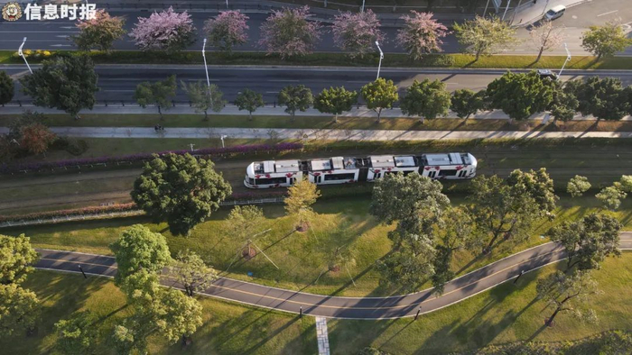 广州首条现代有轨电车线路的电车正在海珠区阅江路附近行驶。信息时报记者 叶伟报 摄