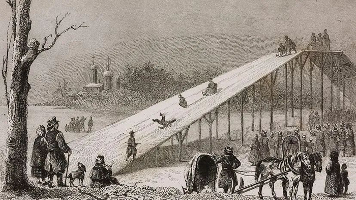 16世纪的俄罗斯年轻人也这么玩,那时候没有楼房,为了体验高速,他们就做了木制的大斜坡,叫做“俄罗斯山”,能有20多米高。