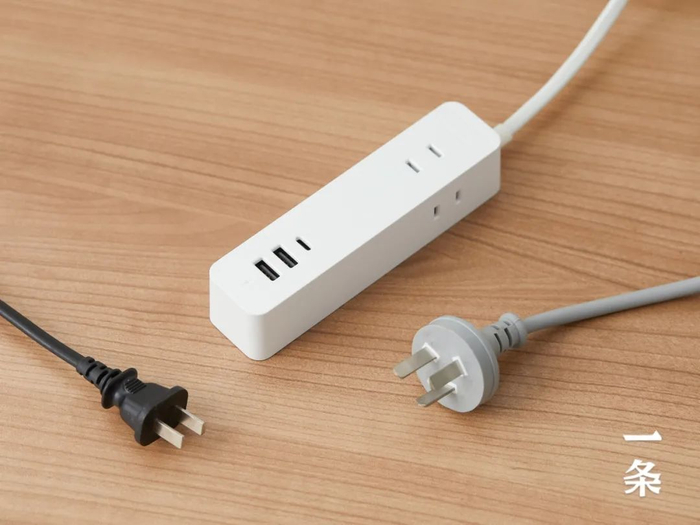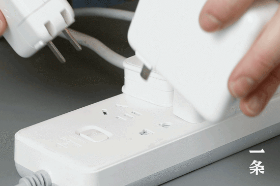 像我们刚刚看到的3个大块头,在常规的插线板上互相抢车位,在这个小插线板上就可以相安无事、和平相处,每个插头都找到了自己的位置。