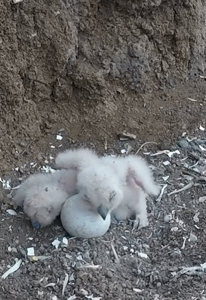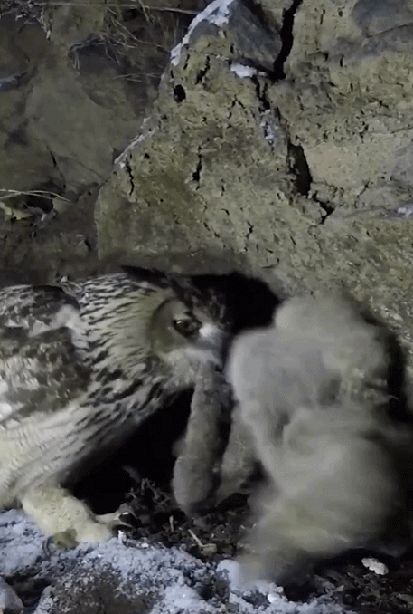 很多人好奇猫头鹰爸爸为什么今天才出现,其实是这样的,猫头鹰是终身一夫一妻制,在妈妈孵蛋的时候,爸爸会守在一公里之内捕食给猫头鹰妈妈,再由妈妈喂给小猫头鹰们。