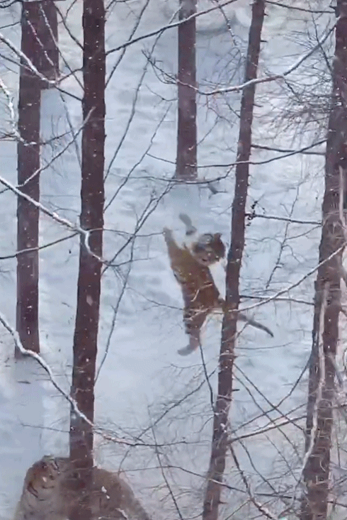 果然再凶猛也逃不开猫科动物的属性,猫科动物天性里边的好奇,让东北虎和橘猫都爱上了跳高。