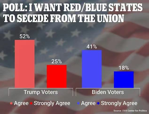 民调显示,超过一半美国前总统特朗普支持者和四成拜登支持者认为,红蓝州“各走各的路”分别建国,对当下的美国而言或许是更好的选择。