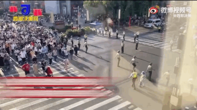 10月1日,上海南京路步行街游客众多,人山人海。为保障游客安全出行,武警战士迈着整齐的步伐,组成拉链式“人墙”。