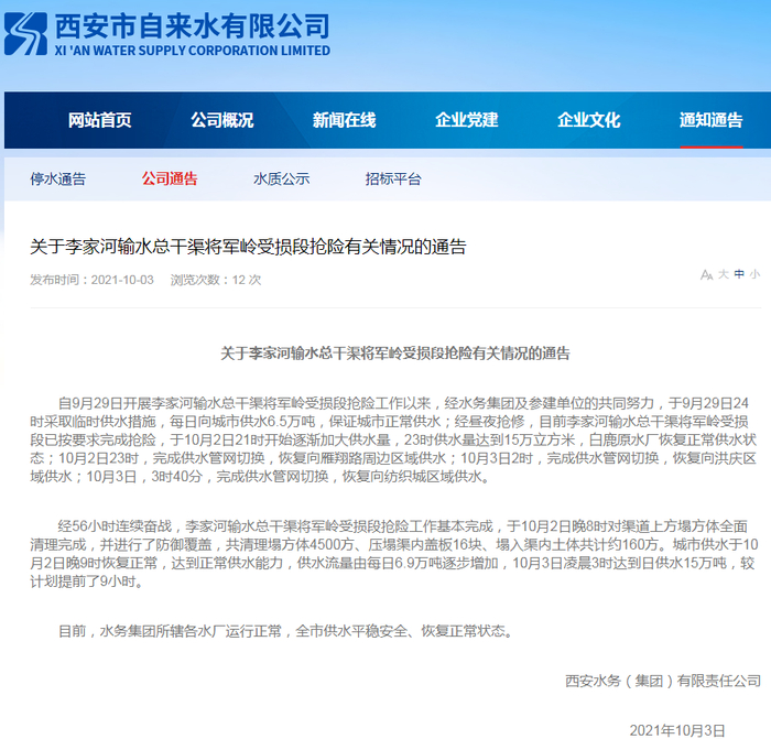 西安水务(集团)有限责任公司3日发布通告:目前,李家河输水总干渠将军岭受损段抢险工作基本完成,水务集团所辖各水厂运行正常,全市供水平稳安全、恢复正常状态。