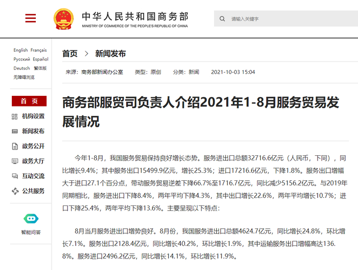 32716.6亿元!今年前8月我国服务进出口总额同比增长9.4%
