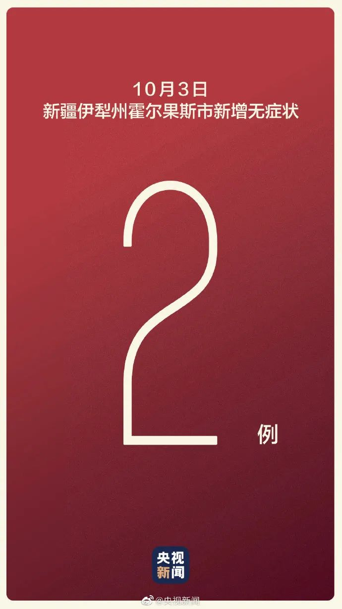 10月3日,新疆伊犁州霍尔果斯市在三天1次常规核酸检测中,发现2人核酸检测结果呈阳性,经专家诊断均为新冠肺炎无症状感染者,目前已转运至霍尔果斯市定点医院进行隔离医学观察。当日,霍尔果斯市已排查密切接触者192人,全部落实隔离医学观察措施。