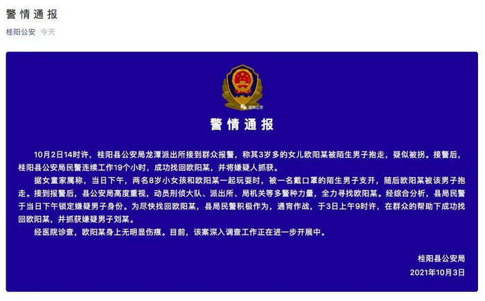 湖南桂阳警方通报3岁女童被抱走:嫌犯已抓获