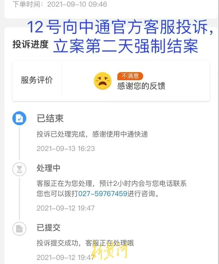 张华在9月12日、9月13日,先后两次向中通快递公司客服投诉此事,但她发现自己的两次投诉在均未得到回应时,却都显示已经处理完成。
