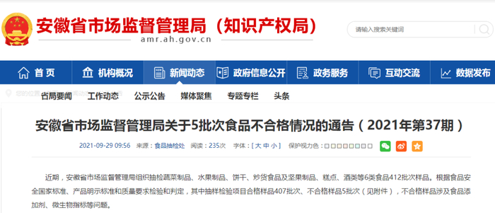 近期,安徽省市场监督管理局组织抽检蔬菜制品、水果制品、饼干、炒货食品及坚果制品、糕点、酒类等6类食品412批次样品。根据食品安全国家标准、产品明示标准和质量要求检验和判定,其中抽样检验项目合格样品407批次、不合格样品5批次,不合格样品涉及食品添加剂、微生物指标等问题。